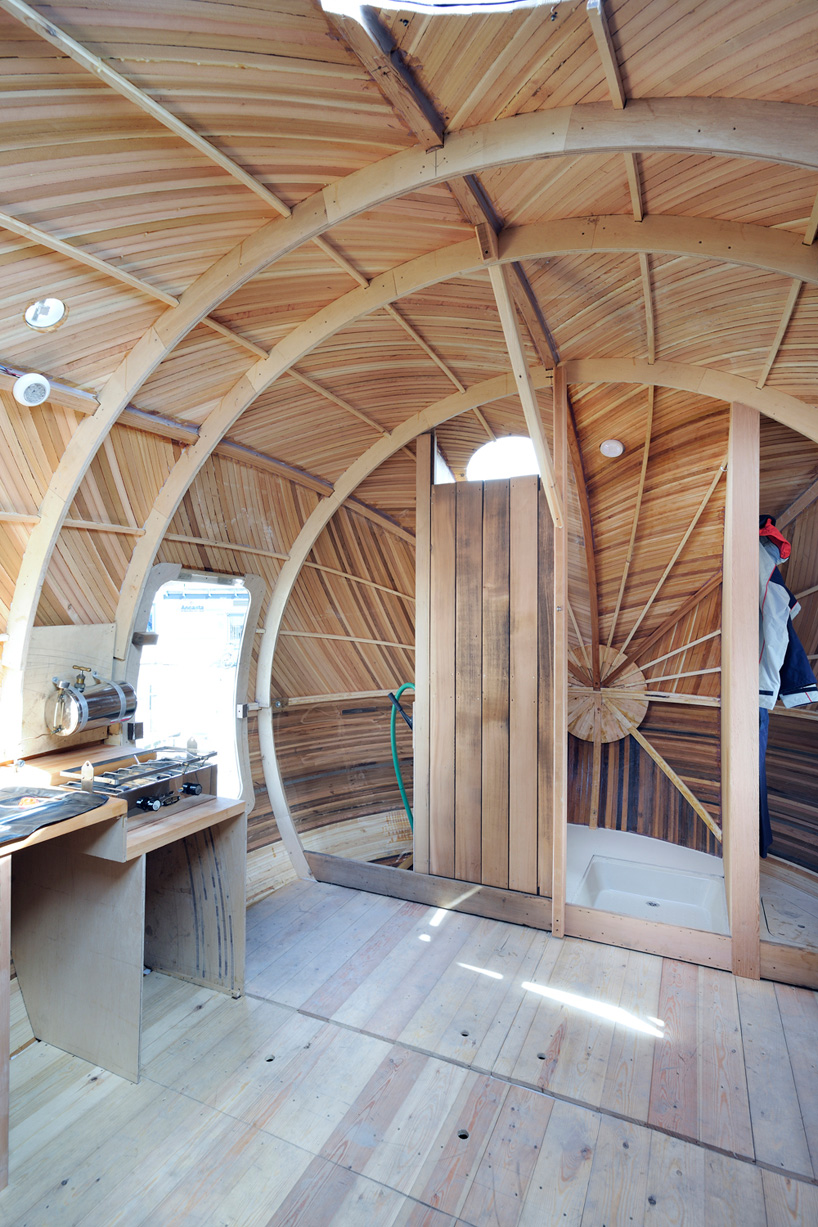 the structure built using boat building techniques and local materials features a bed, a desk, a small stove, and a wet room. it will take on the patina of 730 daily tides below the water line, and 365 days of weathering by wind, rain and bleaching by the sun above.